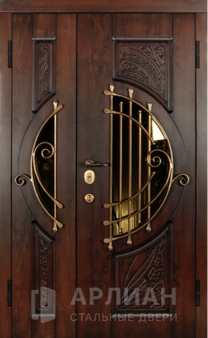 Двухстворчатая входная дверь со стеклом и ковкой №9