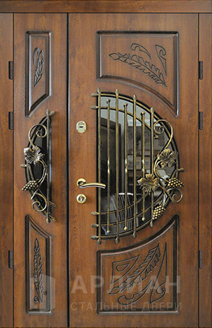 Двухстворчатая входная дверь со стеклом и ковкой №9